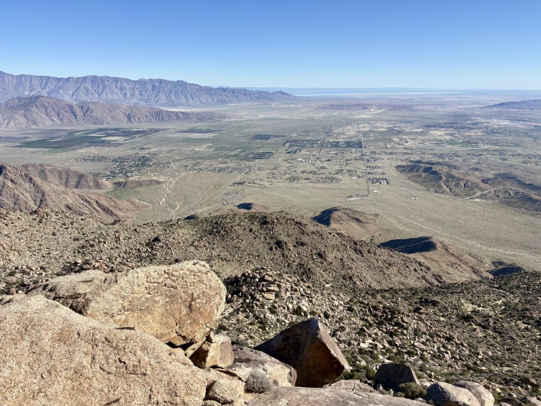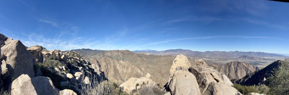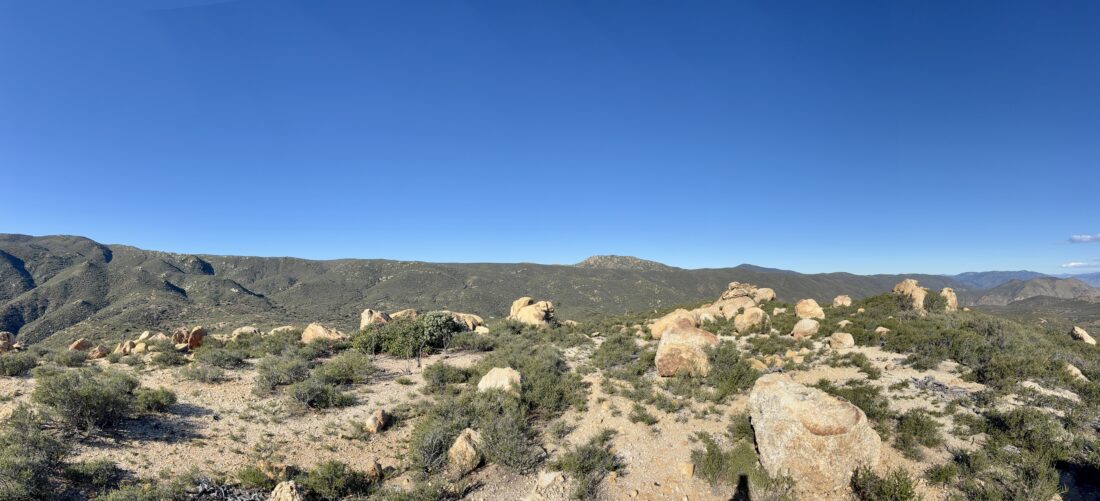 The entire climb from my resting spot to the summit took just over an hour. I snapped some photos and began looking for a nice spot for a much-deserved rest. I actually found a pseudo-cave where I sat down. The coolness of the rock against my back felt great as I ate my lunch and other snacks. I did look around to see if there was a register tucked away, but did not find one. After about 30 minutes, and tending to an issue on my foot, it was time to set off. I soon had to decide on my exit route. Feeling better, both physically and mentally, I opted to retrace my route back to Ranchita. I will say staring across Hellhole Flats and seeing White Benchmark at almost the same elevation did make me question myself.