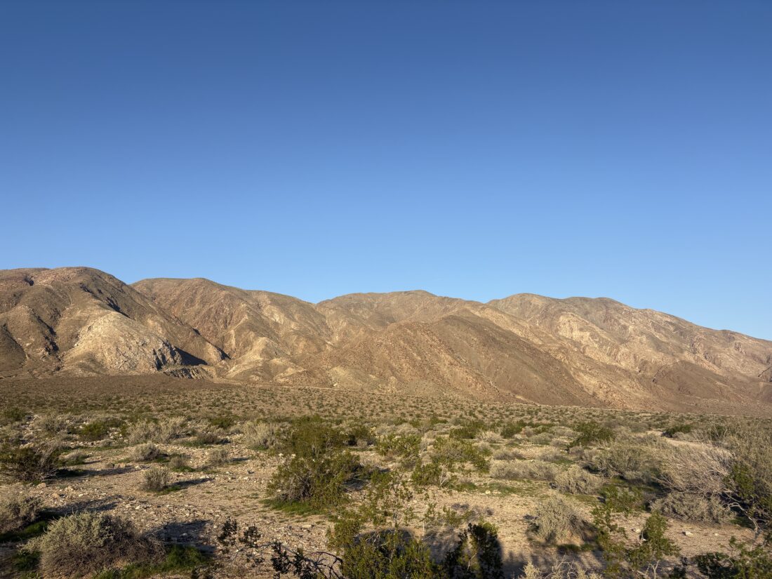 With the successful summit of Kay Benchmark behind me, I headed into Borrego Springs for a burrito. After that, I drove over to Center Market and got a sandwich for dinner and then headed out for McCain Springs. This was the planned camping spot, before hiking to Vallecito Mountains High Point. I had ridden out here a few months back in my friend Dave’s Rubicon, scouting if the trail conditions could be handled by my Subaru. Overall, we felt it looked doable. So, I left the paved road and headed down Fish Creek Wash. This section gave me no worries, as I had driven it multiple times, but as I passed the spot where my son and I had car camped, the uncertainty rose. I continued on, recalling a few of the slightly touchy spots. One obstacle did take two attempts to get over, but the rest was smooth sailing. Soon, I reached the junction to McCain Spring and drove to the end. I had feared that the site might already be taken, but I had it to myself. I set up camp, in no rush as I had plenty of daylight. Enjoyed my sandwich and beer, and as I looked across the desert, it was peaceful as the sun set behind the hills. I set out to make a fire for the evening, but in chopping the wood, the axe nicked my finger. Thankfully, I had taken the “Stop the Bleed” course from Kit Fox Outfitters and handled the minor wound. With that issue addressed, I finished preparing the fire and sat back and enjoyed the flames. As the fire burned itself out, I crawled into the Subaru for some well-earned rest.