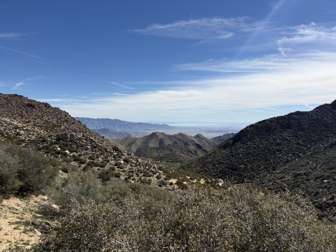 The sun finally rose above the mountains to the east, and a light breeze began to blow. Between the cairns and the use trail, there were no issues as I kept plodding along. From time to time, a steeper section would require some additional effort, but nothing too sustained, and a flatter section would follow to allow for some recovery. My left calf was feeling a bit off, and it gradually tightened as I hiked on, despite attempts to stretch it out. As I passed Mile High off to the east, the Salton Sea finally came into view. I looked across at that peak and gazed at what I had hiked down and up when I had summited it. While I still need to climb it again, I think I will take an alternate route down.