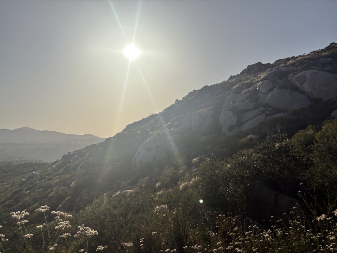 Our discussions now turned to an important matter: lunch. As we made our way down, we enjoyed the wildflowers that still lined the sides of the trail. When we reached the junction with the Canyon Oak trail, Becca’s shoes were still feeling good, so we opted to add on a bit more trail time. A few other campers and their dogs passed us along the way. I showed Ted and Becca the “Observatory”, two sloped benches that allow you to lean back and enjoy the night sky. Shortly thereafter, we returned to the campground and back to our starting point. Tossing our gear back into the car, we began our drive home. Dudley’s won out for our lunch spot. Unfortunately, as we approached Mt. Woodson, the highway was closed due to a fatality, so we had to take an alternate route home. All told, we hiked 3.3 miles, with 633 feet of gain.